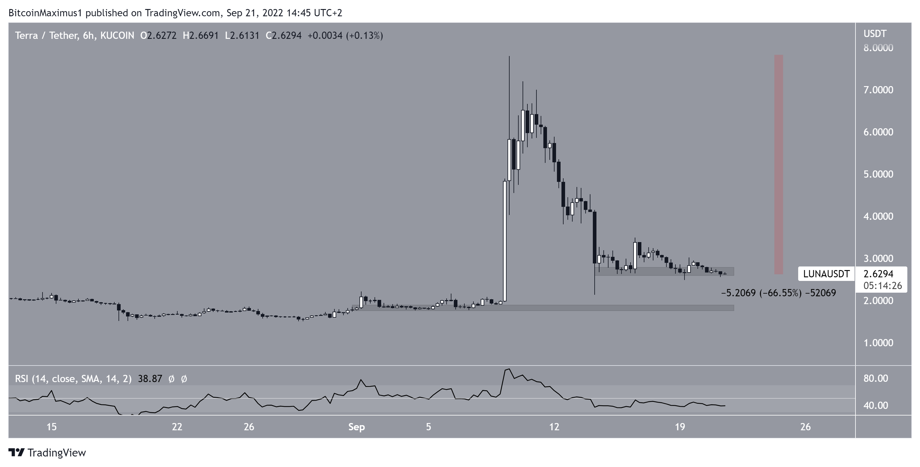 Además, el RSI de seis horas está por debajo de 50, una señal bajista que indica que es probable que se produzca una ruptura. Si LUNA cae por debajo del soporte actual de 2.60 dólares, la siguiente área de soporte más cercana estaría en 1.60 dólares.