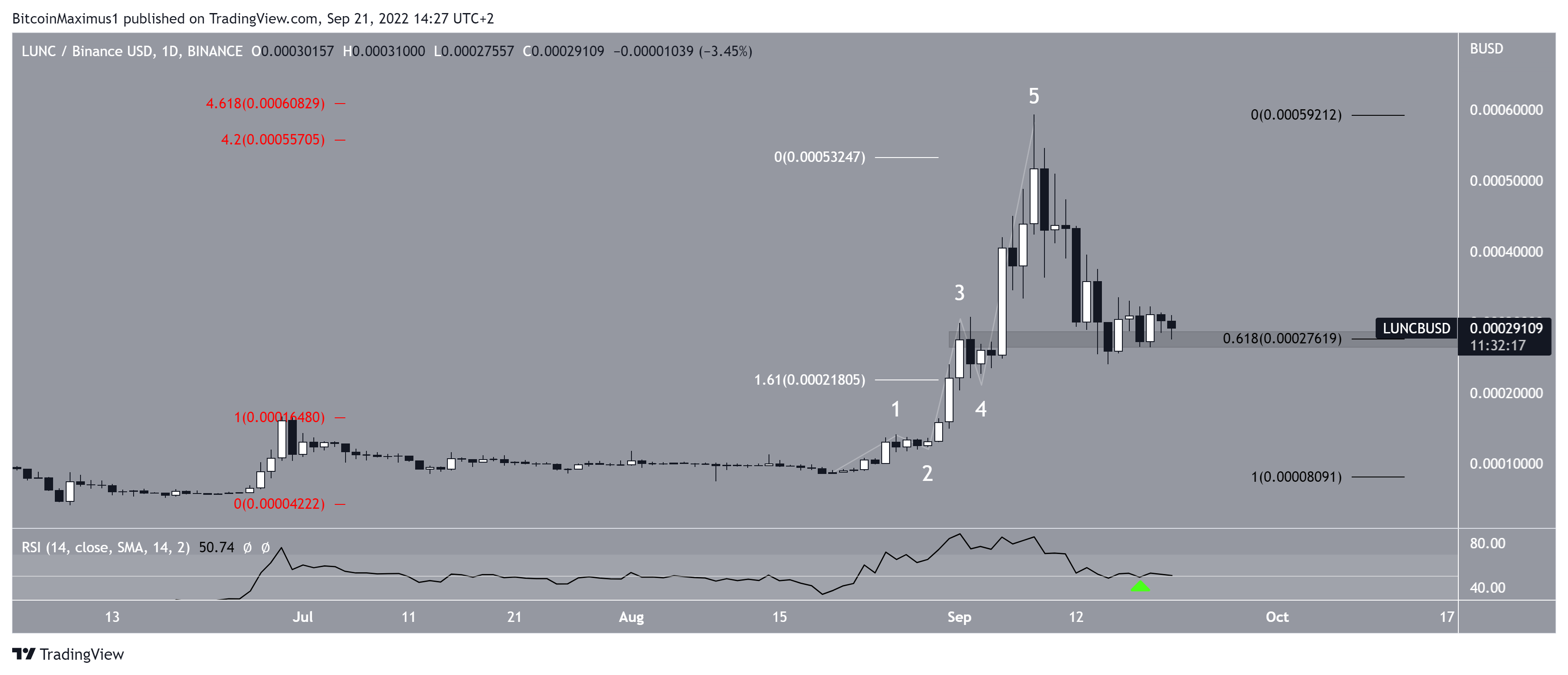 LUNC ha estado cayendo desde que alcanzó un máximo de 0.00059 dólares el 8 de septiembre. El máximo se produjo en una confluencia de niveles importantes de Fibonacci, creados por la extensión 4.2-4.618 del movimiento ascendente original (rojo) y la longitud de 1.61 de las ondas uno y tres (blanco). Por lo tanto, se esperaba que actuara como un importante tope local.