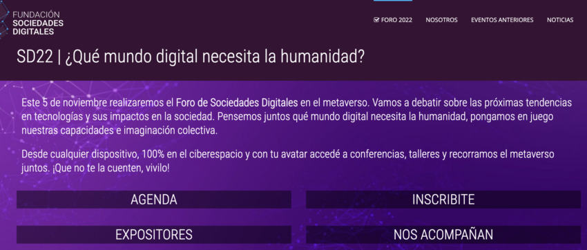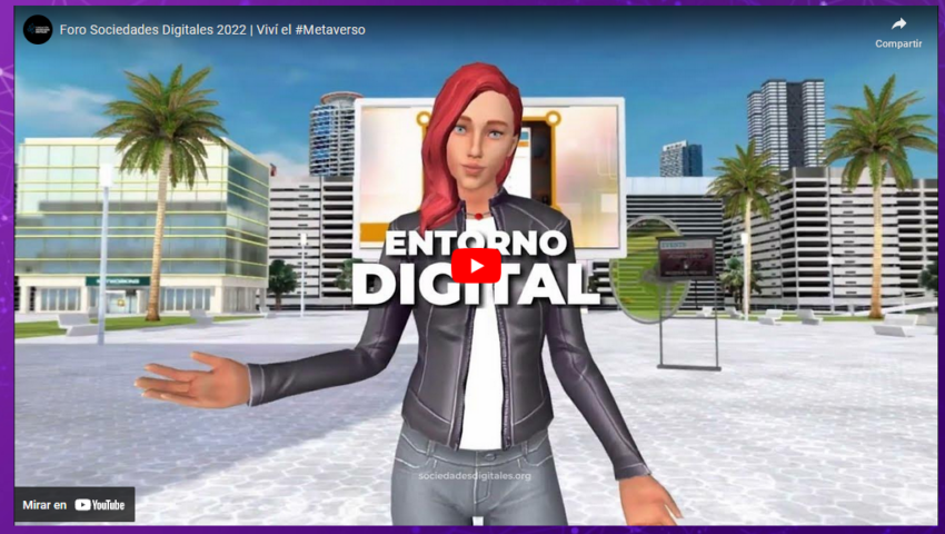 “Este 5 de noviembre realizaremos el Foro de Sociedades Digitales en el metaverso. Vamos a debatir sobre las próximas tendencias en tecnologías y sus impactos en la sociedad. Pensemos juntos qué mundo digital necesita la humanidad, pongamos en juego nuestras capacidades e imaginación colectiva. Desde cualquier dispositivo, 100% en el ciberespacio y con tu avatar accedé a conferencias, talleres y grabamos el metaverso juntos. ¡Que no te la cuenten, vívilo!”