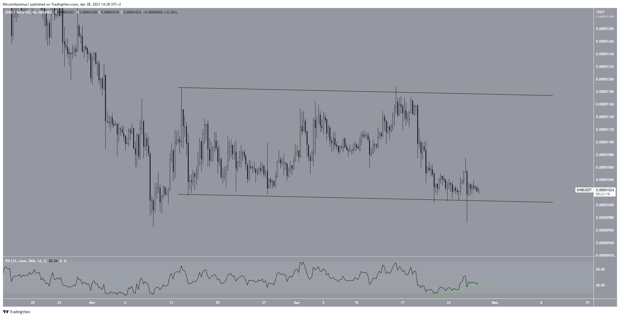 El precio SHIB se negocia dentro de un canal paralelo descendente. Este es un tipo de patrón correctivo en el que el precio rebota entre las líneas de resistencia y soporte del patrón antes de finalmente romper.