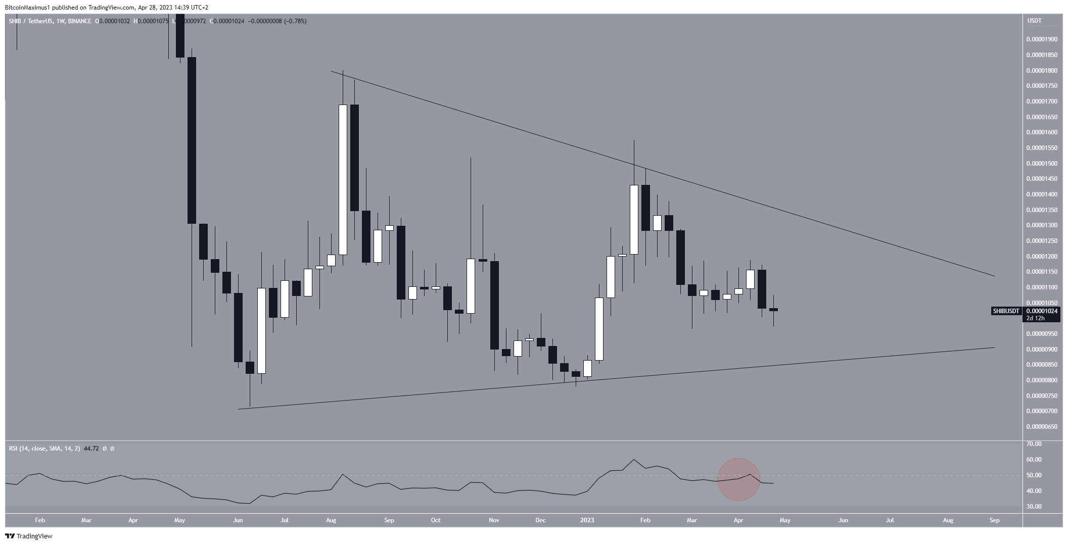 El análisis del marco de tiempo diario muestra que el precio de SHIB se ha negociado dentro de un triángulo simétrico desde junio de 2022.