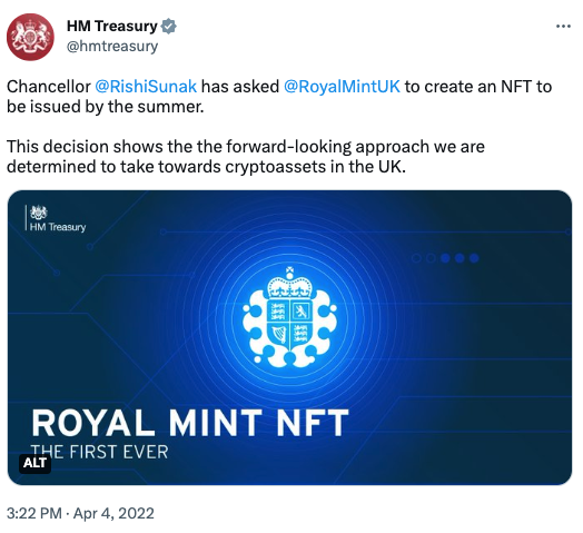 La medida, propuesta inicialmente por el entonces ministro de Hacienda y actual primer ministro, Rishi Sunak, fue anunciada en la primavera de 2022 por la Royal Mint del Reino Unido, siendo el estado pionero en lanzar una colección NFT oficial propia de la nación. Adicionalmente, el gobierno británico también estaba tomando medidas para regular el uso de las denominadas stablecoins como forma de pago reconocida.