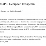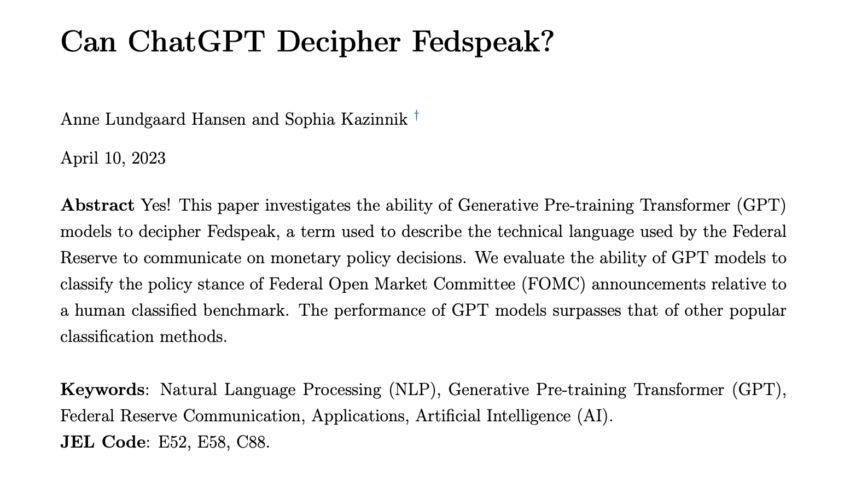 La primera llamada Can ChatGPT Decipher Fedspeak”, era un estudio que probaba al chatbot para ver si este podía descifrar a un comunicado de la Reserva Federal para ver si los clasificaba entre los que son hawkish, o de una política monetaria de línea dura, o si estos eran más de una política económica expansiva.