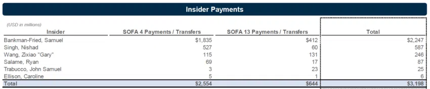 Una presentación reciente en el caso de bancarrota en curso de FTX reveló que Bankman-Fried había recibido el pago más grande de 2,2 mil millones de dólares. En comparación, el exdirector de ingeniería Nishad Singh recibió alrededor de 587 millones de dólares, mientras que Wang recibió alrededor de 246 millones de dólares.