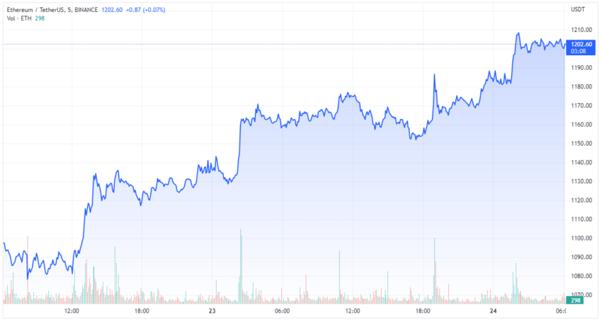 El precio de Ethereum está comenzando a ver un impulso alcista, saltando un 10% a más de 1,200 en las últimas 24 horas.