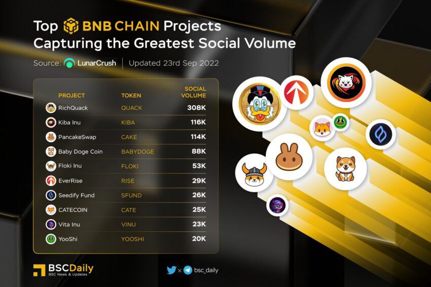 RichQUACK encabeza el listado con un Volumen Social de 308 mil, casi triplicando a su más cercano competidor, Kiba Inu (KIBA) el cual posee 116 mil. El top 5 proyectos con más Volumen Social en BNB Chain lo completan PancakeSwap (114 mil), Baby Dogecoin (88 mil) y Floki Inu (53 mil).