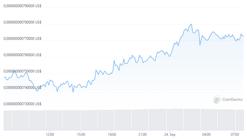 Las importantes noticias que giran alrededor de RichQUACK han generado leves ganancias en el precio de QUACK. Al momento de la publicación, la criptomoneda meme cotiza en 0.000000000772 dólares, registrando un aumento del 3.3% en las últimas 24 horas, según los datos de CoinGecko.