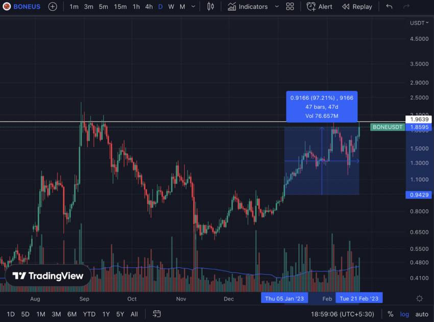 BONE es el token de gobernanza del ecosistema ShibaSwap. El mes pasado, el 5 de enero, la red Shibarium confirmó en Twitter que BONE se usaría para las tarifas de gas en el protocolo de Capa 2 . Desde entonces, el precio del token ha subido casi 100% y se cotiza a 1,8595 dólares al momento de escribir este artículo.
