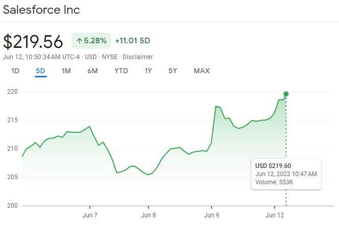Siguiendo las nuevas noticias del lanzamiento de los productos de la IA, el stock de la empresa está en alza. Las acciones de Salesforce en el mercado se encuentran cotizando en un valor de 219.60 dólares por acción y han registrado una subida del 1.93%, al momento de escribir el artículo.