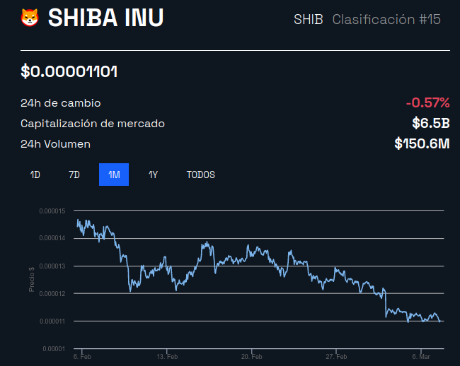 Actualmente Shiba Inu se ubica en la posición 15 en el ranking de criptomonedas con una capitalización de mercado de 6,48 mil millones de dólares.