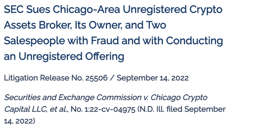 La SEC presentó una demanda contra Chicago Crypto Capital (a veces llamada CCC), su propietario Brian Amoah y dos gerentes de ventas, Darcas Oliver Young y Elbert “Al” Elliott, por supuestamente defraudar a los inversores durante su oferta no registrada de valores de criptoactivos.