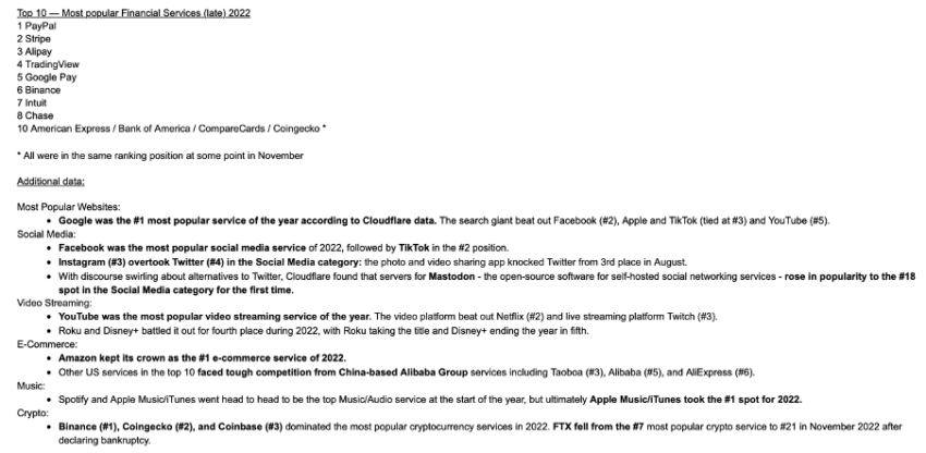 Según los datos compartidos: “Binance y CoinGecko fueron los únicos servicios cripto que entraron en la categoría de servicios financieros, junto con pesos pesados de la industria como PayPal, Stripe, Chase y otros”.