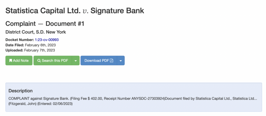 La firma de trading algorítmico Statistica Capital presentó una supuesta demanda colectiva contra Signature Bank, que admite criptomonedas, por su supuesto conocimiento de la mezcla de fondos entre el exchange en bancarrota FTX y Alameda Research.