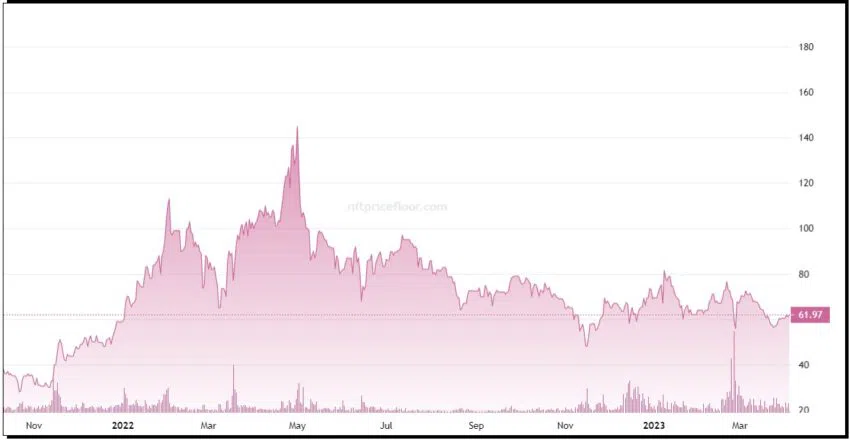 Los datos de NFT Price Floor revelan que Bored Ape Yacht Club tiene 5758 propietarios únicos con un precio mínimo de casi 62 ETH (con un valor aproximado de 112,220 dólares a los precios actuales).