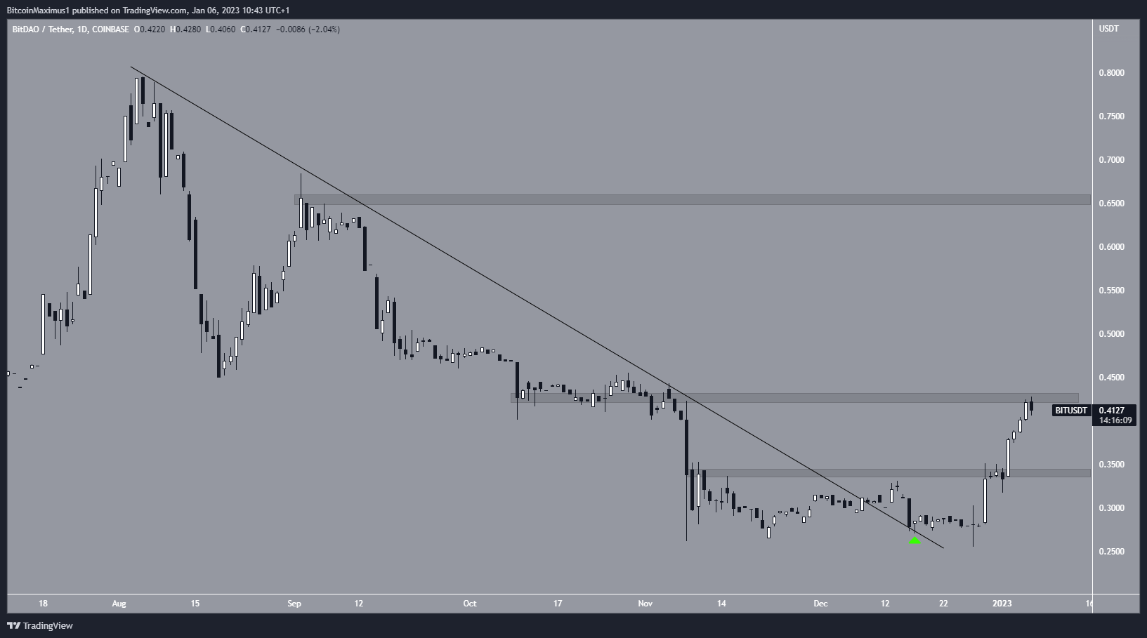 Actualmente, el precio del BIT se negocia justo por debajo del área de resistencia horizontal de 0.42 dólares. Si se mueve con éxito por encima de ella, el precio del BIT podría aumentar a 0.65 dólares.