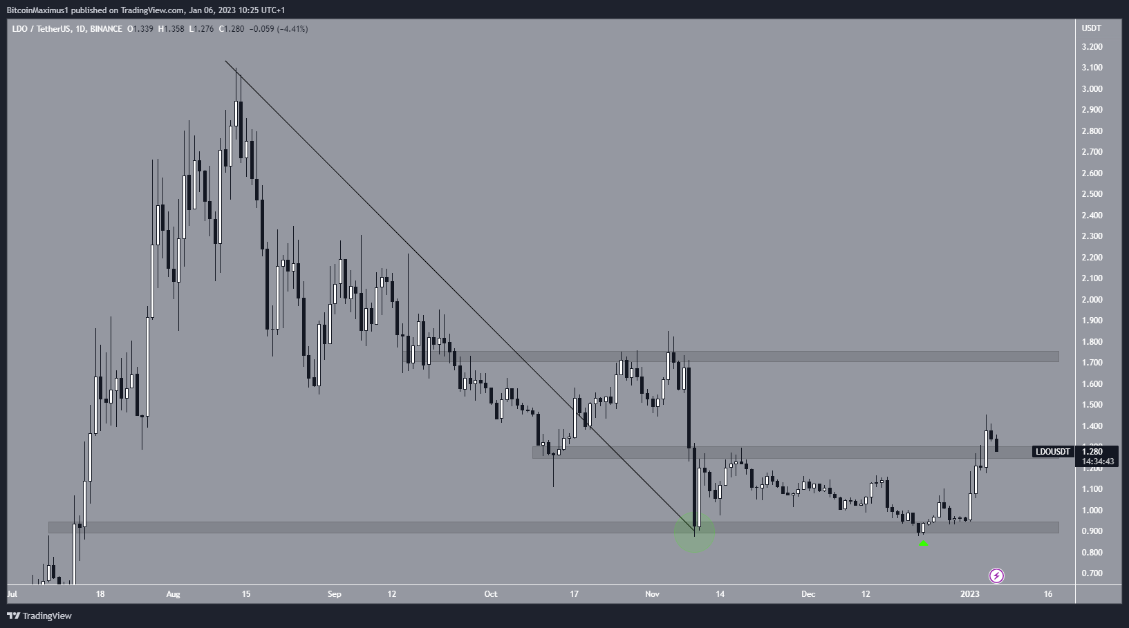 Después del segundo mínimo (icono verde), el precio inició un fuerte movimiento ascendente y salió del área de resistencia de 1.27 dólares. Si el precio LDO valida con éxito el área de 1.27 dólares como soporte, podría aumentar a 1.75 dólares. Por otro lado, una ruptura por debajo de este nivel podría conducir a una caída hacia el área de soporte de 0.90 dólares.
