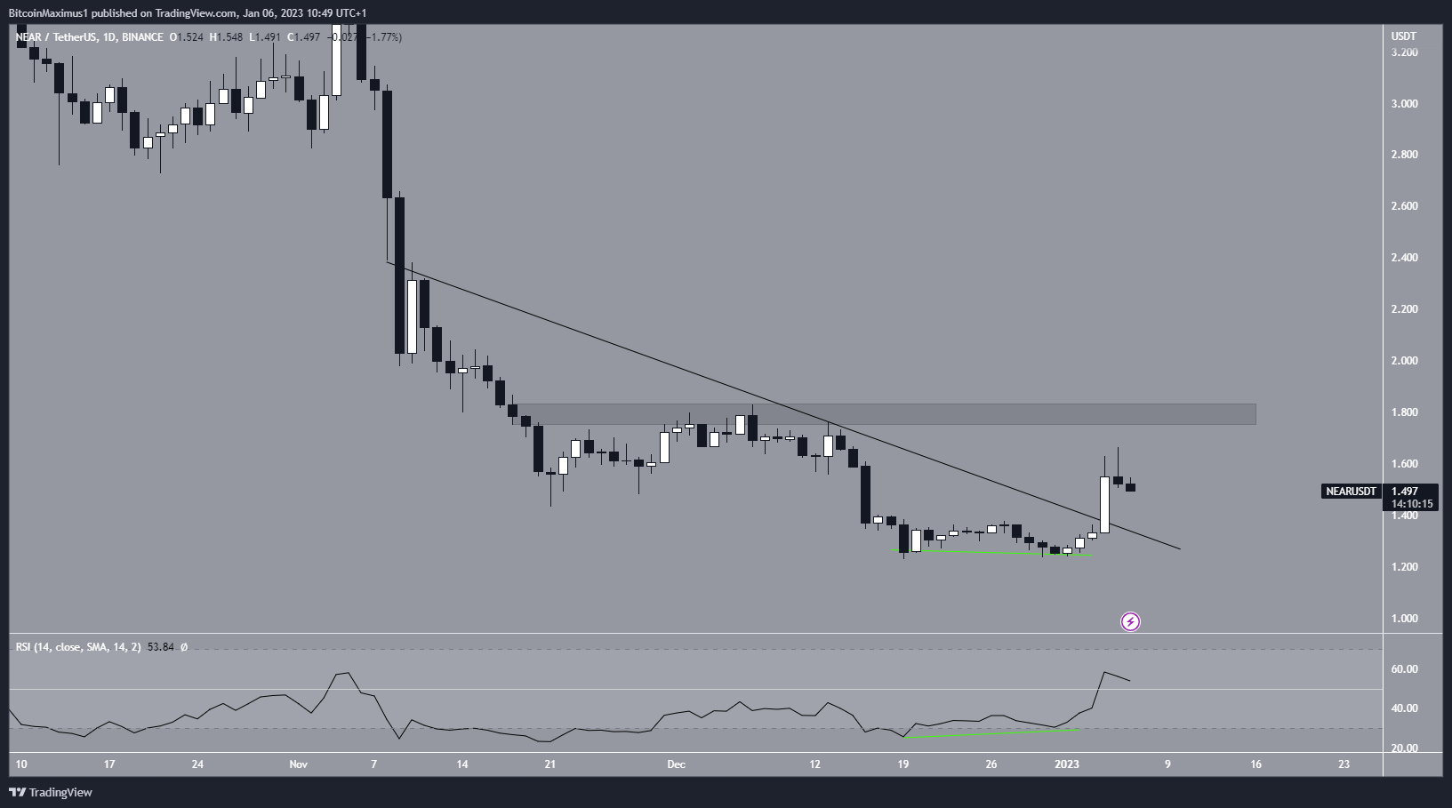 Similar a BitDAO, NEAR es otra altcoin que salió de una línea de resistencia descendente. NEAR experimentó ruptura después de que creó un patrón de doble fondo que se combinó con una divergencia alcista en el RSI. Tales divergencias a menudo preceden a los movimientos ascendentes.