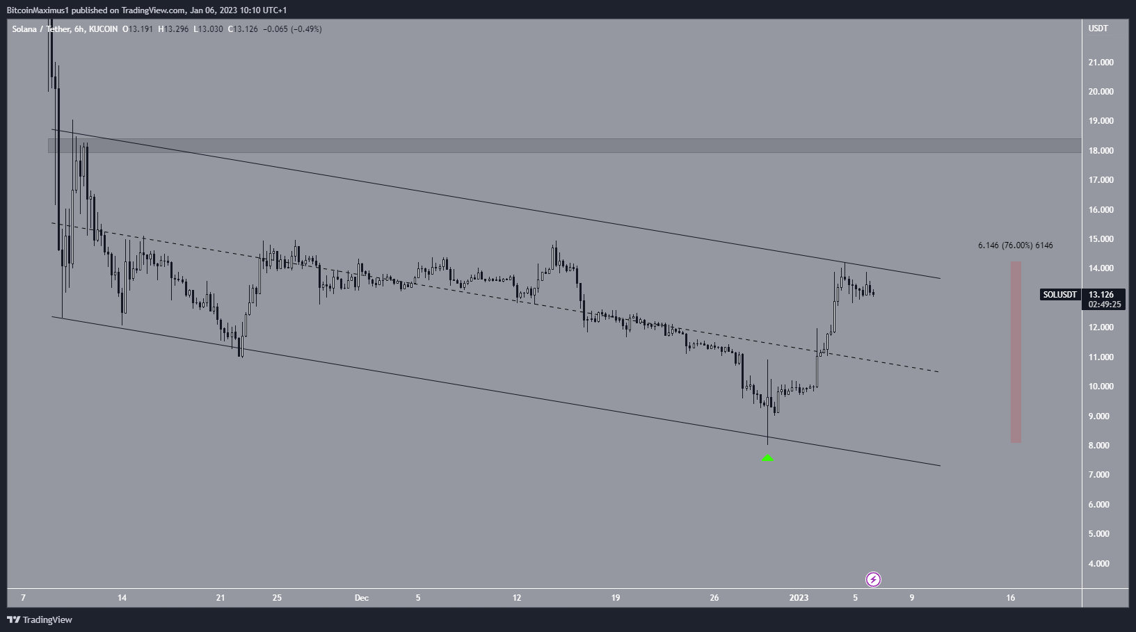 El precio SOL ha caído dentro de un canal paralelo descendente desde el 10 de noviembre. El movimiento descendente condujo a un mínimo de 8 dólares el 29 de diciembre. El rebote resultante creó una mecha inferior larga y validó la línea de soporte del canal (icono verde). Inició un movimiento alcista que hizo que los precios aumentaran en un 76%. Esto llevó el precio del SOL a la línea de resistencia del canal.