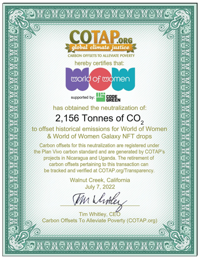 Hay otras formas de hacer el bien además de ganar dinero. El año pasado, World of Women se convirtió en la primera colección NFT de primer nivel en compensar toda su huella de carbono.