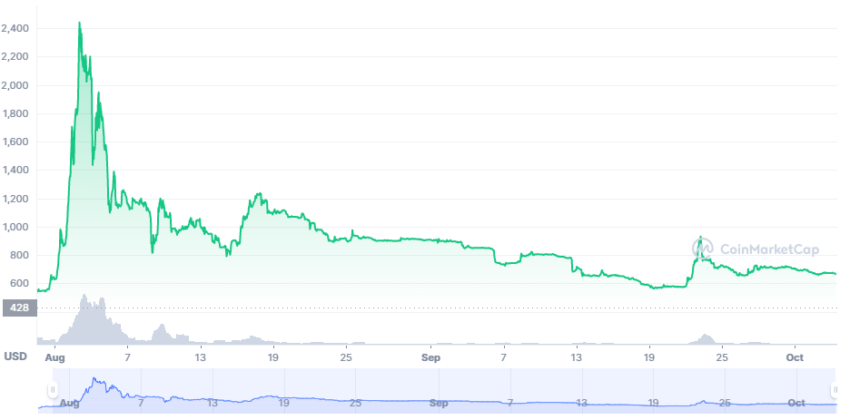 Según CoinMarketCap (CMC), Tao Te Ching alcanzó su punto máximo el 3 de agosto a un precio de 2,440 dólares. Esto representa una capitulación del 73% a su precio actual de 661 dólares, pero la moneda se mantiene por encima de su nivel más bajo de ~540 dólares.