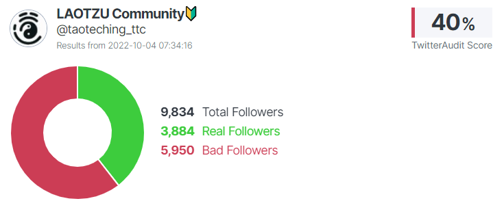 Tao Te Ching tiene un seguimiento de Twitter relativamente modesto de 9,834, por lo que los usuarios pueden suponer que se trata principalmente de tráfico orgánico. Una verificación en Twitter Audit califica el proyecto con un 40% bastante bajo, lo que sugiere que la mayoría de sus seguidores son cuestionables.