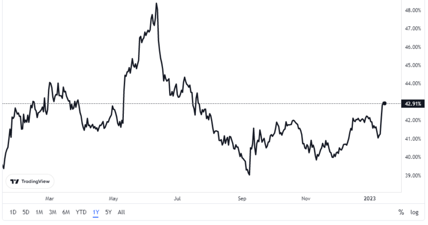 Al momento de la publicación, la tasa de dominio de Bitcoin se encuentra en 42.91%, según los datos de TradingView. La BTCD no registraba una marca similar desde el pasado mes de agosto de 2022.