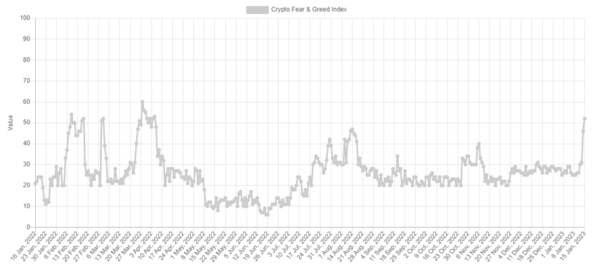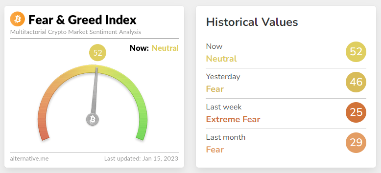 De acuerdo a los datos de Alternative.me, el Índice de Miedo y Codicia de Bitcoin se encuentra actualmente en 52. Esto significa que el mercado cripto se encuentra experimentando un sentimiento neutral.