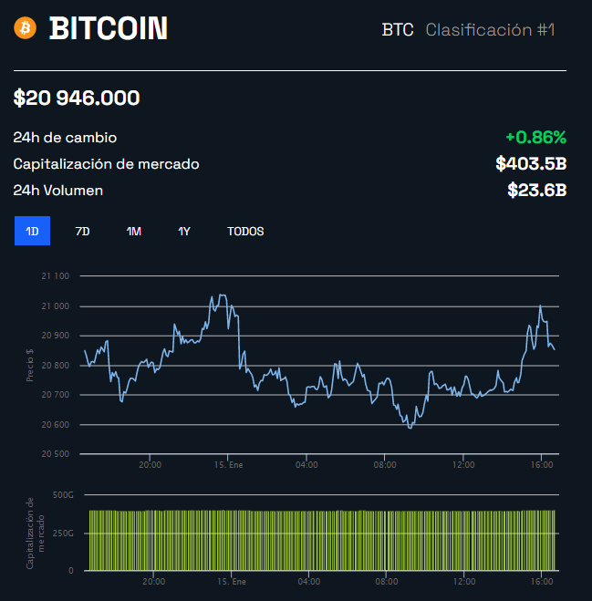 Al momento de la publicación, el precio de BTC cotiza en 20,946 dólares, experimentando un leve aumento del 0.86% en las últimas 24 horas. Sin embargo, Bitcoin se ha disparado más del 25% desde comienzos de año.