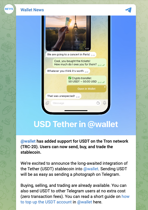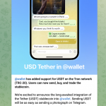 “@wallet ha agregado soporte para USDT en la red Tron (TRC-20). Los usuarios ahora pueden enviar, comprar e intercambiar la stablecoin. Enviar USDT será tan fácil como enviar una fotografía en Telegram. Puede comprar y vender USDT directamente dentro del bot”.