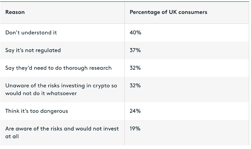 Ahora hay una creciente evidencia de que aquellos que obtienen criptomonedas compran, mientras que aquellos que no lo hacen corren el peligro de quedarse atrás. Todavía hay un número significativo de residentes del Reino Unido que aún tienen que sumergir el dedo del pie en el agua cripto y la mayoría de ellos parecen decididos a no meterse nunca.