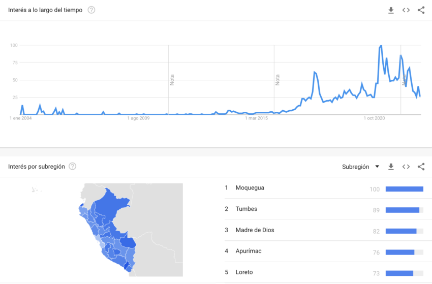 Además, el creciente interés de los peruanos por investigar sobre esta tecnología se ha visto manifestado en la siguiente gráfica, donde el equipo de BeInCrypto Perú ha preparado un análisis de tendencias en búsqueda por los peruanos.