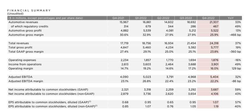 El fabricante de autos eléctricos, Tesla, reveló los resultados de su último reporte trimestral, donde tuvo ingresos automotrices por 21,3 mil millones de dólares, e ingresos totales por 24,318 mil millones de dólares en el cuarto trimestre de 2022, lo que representa un alza de 33 y 37%, respectivamente, en comparación con el año anterior.