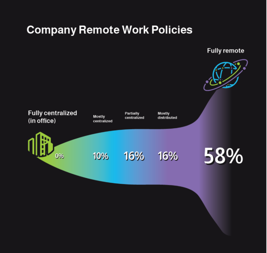 “La mayoría de las empresas encuestadas se consideran “totalmente distribuidas” y tienen el trabajo remoto como el principal modelo operativo de sus negocios”. Además agregó: