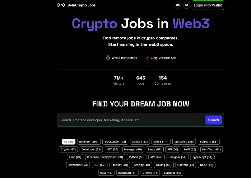BeInCrypto Jobs actualmente enumera 645 puestos vacantes de 154 empresas dentro de diferentes nichos que van desde marketing hasta desarrollo de software e investigación de contenido.