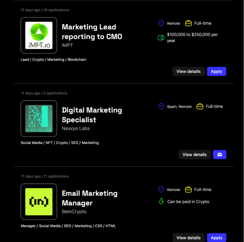Por ejemplo, IMPT, un nombre líder en la industria de la blockchain, está contratando activamente a un líder de marketing con una compensación de hasta 250,000 dólares por año. Otras empresas, como Nexxyo Labs e incluso BeInCrypto, están contratando para funciones basadas en marketing.