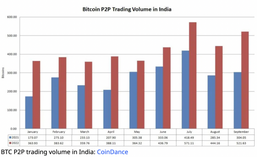El volumen de trading de BTC P2P en India ha aumentado tras la implementación de leyes fiscales estrictas. El tercer trimestre de 2022, en particular, experimentó un gran crecimiento.