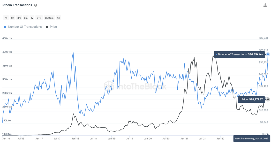 Según los datos de IntoTheBlock, la cantidad promedio de transacciones diarias durante la semana que comenzó el 24 de abril fue de 396,350.