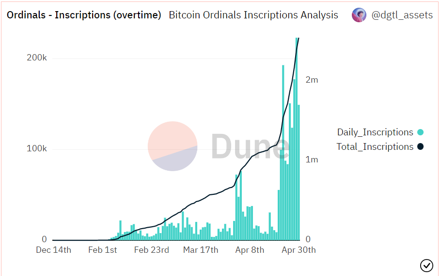 Según los datos de Dune Analytics, el número de inscripciones en Bitcoin ahora supera los 2,5 millones, alcanzando un máximo histórico de inscripciones diarias de 223,311 el 29 de abril.