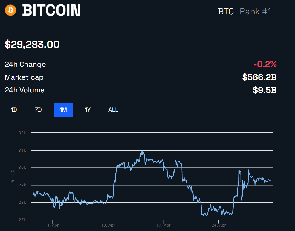 BTC continuó cotizando por encima de los 29,000 dólares a pesar de una leve caída del 0,2 % en las últimas 24 horas, según BeInCrypto.