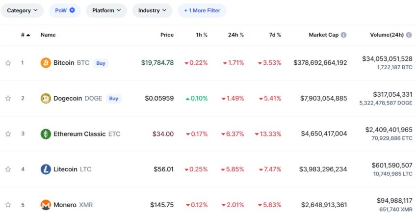Por otra parte, el ranking PoW de CoinMarketCap ahora ha clasificado a Dogecoin bajo Bitcoin como la criptomoneda más grande en la categoría.
