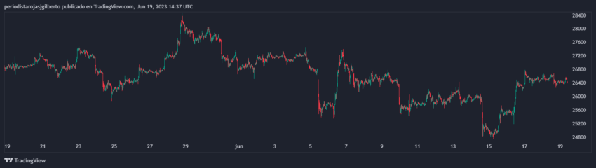 En los últimos 30 días, el precio de BTC ha oscilado entre los 28.452 dólares y los 24.456 dólares. El bajón en su valor se debió principalmente a las demandas de la Comisión de Bolsa y Valores (SEC, por sus siglas en inglés) de Estados Unidos contra Binance y Coinbase, así como a la ‘advertencia’ del presidente de la Reserva Federal (FED, por sus siglas en inglés) de ese país, Jerome Powell, sobre unas muy posibles nuevas subidas en los tipos de interés para este mismo año.