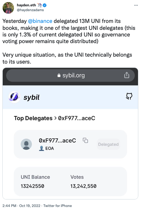 La DAO de Uniswap es uno de las comunidades descentralizadas más extensas del sector DeFi. Su fundador acusó a Binance mediante un comunicado en Twitter como el exchange de criptomonedas más grande del mundo en capitalización ha conseguido amasar un extenso botín de tokens UNI, los cuales proporcionan poder de voto, convirtiéndose así en uno de los titulares más grandes del ecosistema de Uniswap.