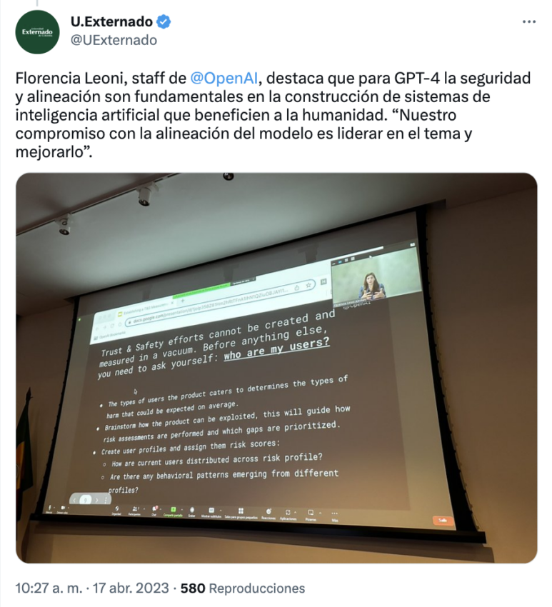 “Es una forma de conocimiento ChatGPT-4 y por ello es importante analizar las oportunidades y desafíos éticos y sociales que implica la inteligencia artificial generativa, incluyendo cuestiones de sesgo, imparcialidad, derechos de propiedad intelectual, privacidad y seguridad. Tratamos de explicar cómo la IA puede impulsar el crecimiento económico, el mercado laboral e innovación, etc”.
