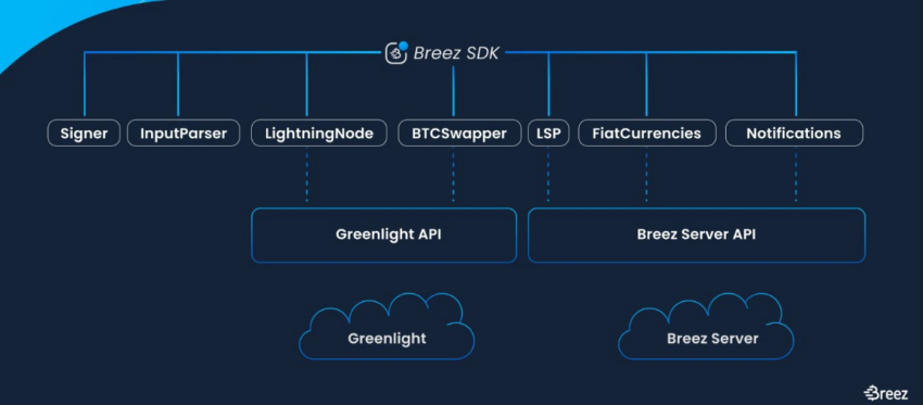 La infraestructura de Breez SDK cuenta con varios módulos, entre los que se incluyen el nodo de Lightning, un swapper o convertidor de Bitcoin a monedas fiat y más. En la siguiente imagen, se pueden ver los recursos a los que los desarrolladores pueden acceder para integrar Lightning a sus aplicaciones o servicios.