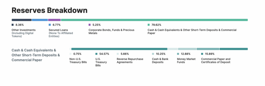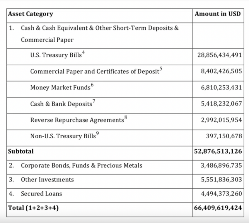 La reserva equivale al valor de USDT que la firma tenía en circulación en ese momento, que ascendía a 66.410 millones de dólares. Paolo Ardoino, el CTO de Tether, dijo que las tenencias de papel comercial han disminuido desde entonces a 50 millones de dólares y que las letras del Tesoro de Estados Unidos ahora representan casi el 60% de las reservas.