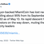 El precio de MiamiCoin ahora ha bajado 99% desde su pico de septiembre de 2021. Una caída de precios tan importante está llamando la atención. MiamiCoin no solo se enmarcó como la primera CityCoin en ingresar al mercado cripto, sino que también fue respaldada por el propio alcalde de Miami, Francis X. Suarez.