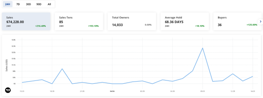La colección Digital Trading Cards fue testigo de un aumento del 220% en el volumen de transacciones en las últimas 24 horas. Se realizaron ventas de alrededor de 75,000 dólares en un día, según datos de CryptoSlam.