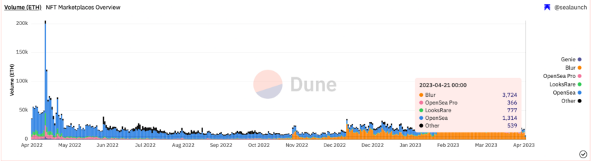 Curiosamente, el nuevo marketplaces Blur estaba gestionando ese volumen por sí solo en diciembre de 2022. Además, el tamaño medio de las ventas también se ha desplomado, hasta casi 18,7 ETH en la actualidad.