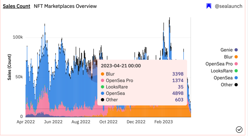 Según el dashboard de Dune, el recuento de ventas de NFT en los marketplaces populares es de 9,887.