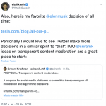“Además, aquí está mi decisión favorita @elonmusk de todos los tiempos: https://tesla.com/blog/all-our-patent-are-belong-you. Personalmente, me encantaría ver a Twitter tomar más decisiones con un espíritu similar a *que *. IMO @sriramk las ideas sobre la moderación de contenido transparente son un excelente lugar para comenzar”.